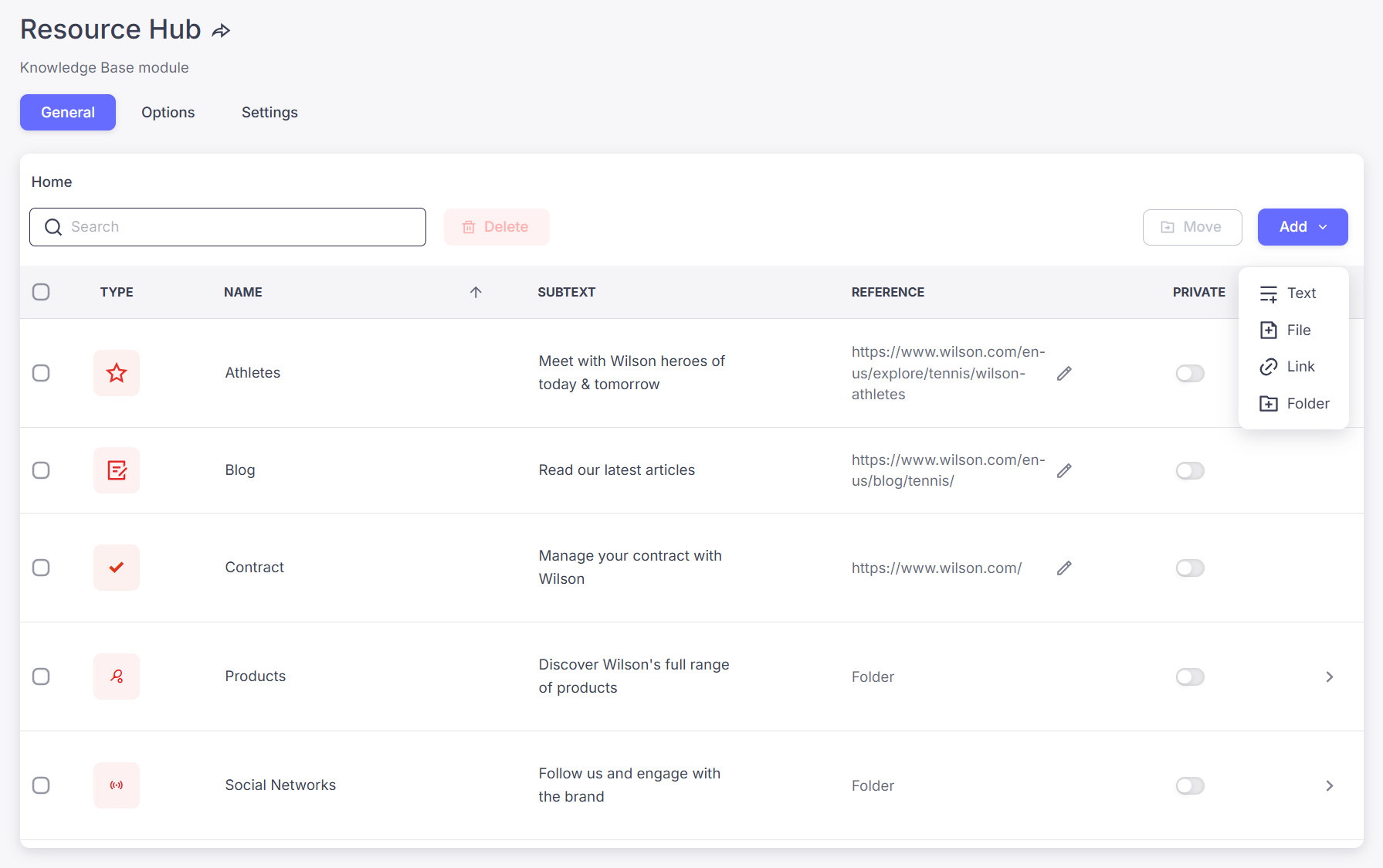 Click on "Add" and choose the type of content you want to add: enriched text, file, link or folder