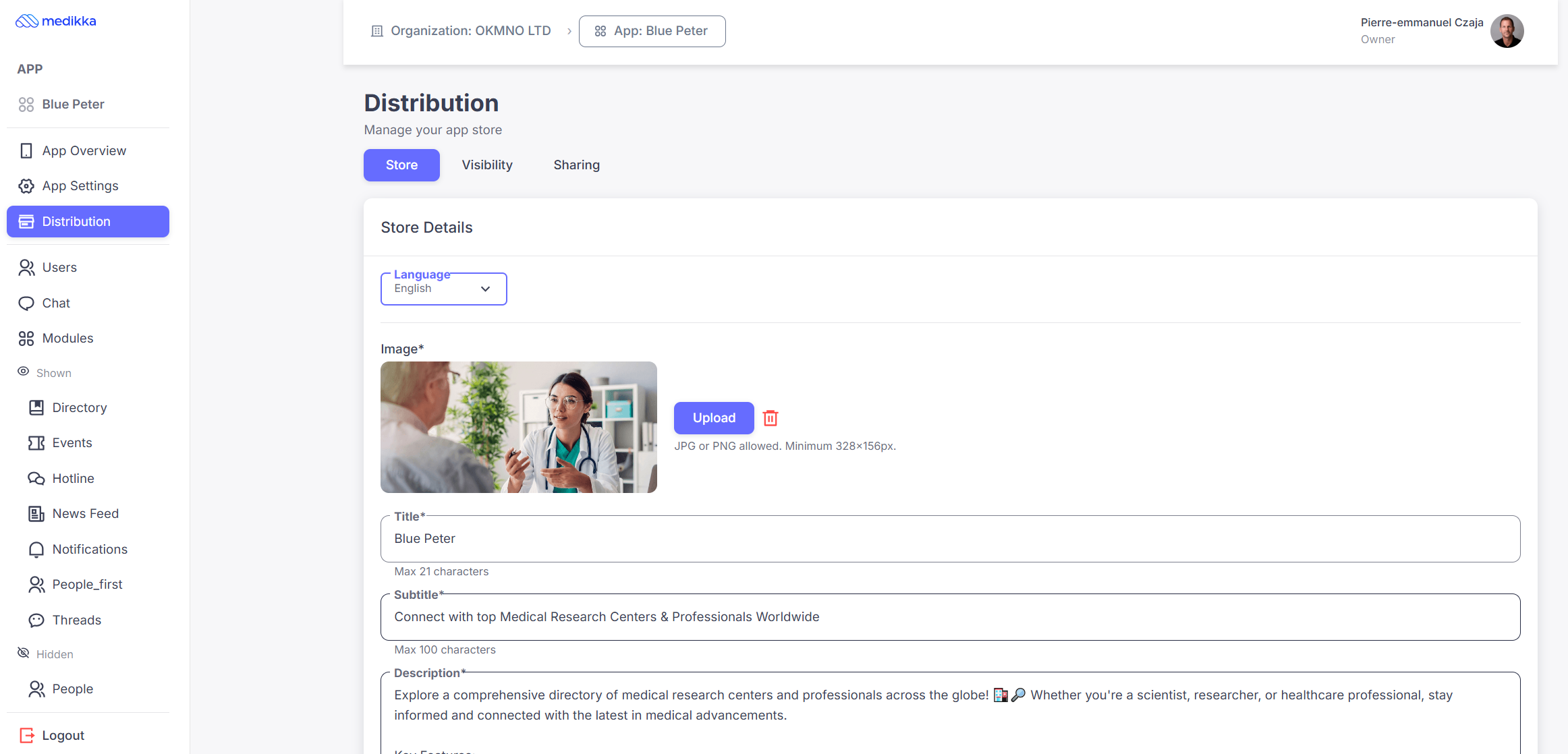 This is where you manage the appearance of your app in the Medikka app store.