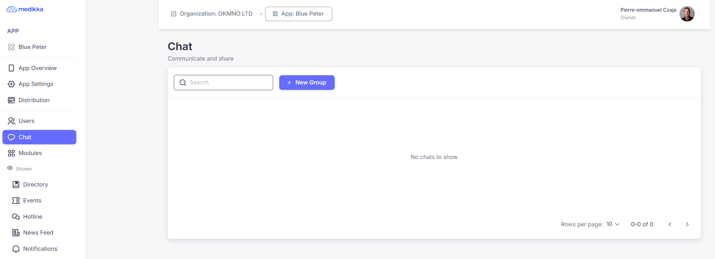 Group chats created from the App Builder will automatically appear in the Chat app inside Medikka.