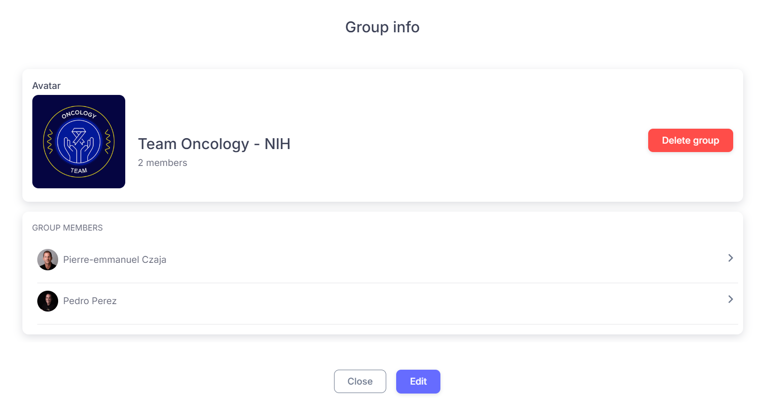 Step 2 - Click Edit to edit the info and members or click Delete to delete group