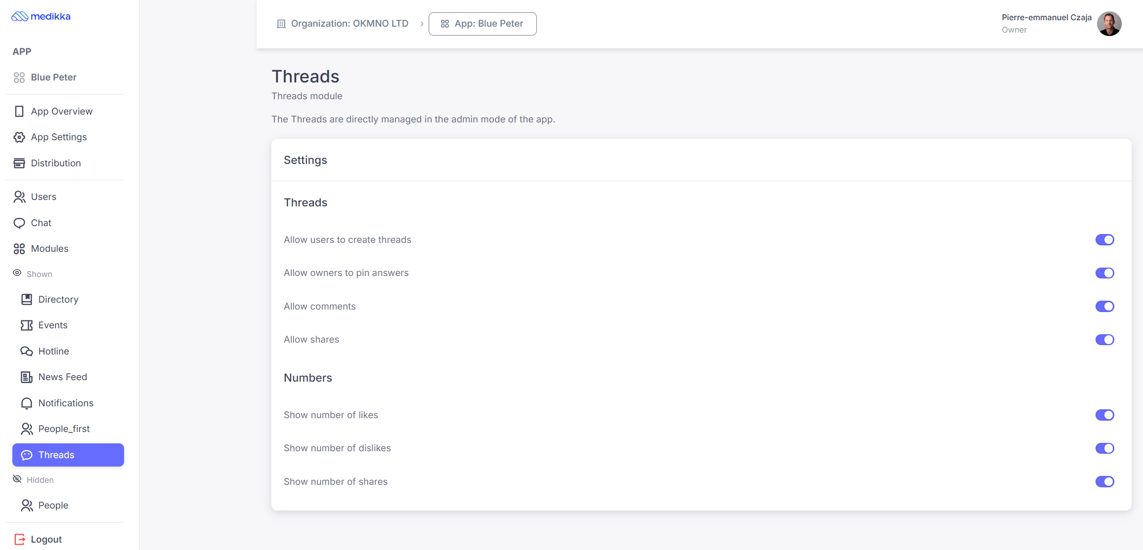Threads are created and moderated from the Medikka app, not from the App Builder.