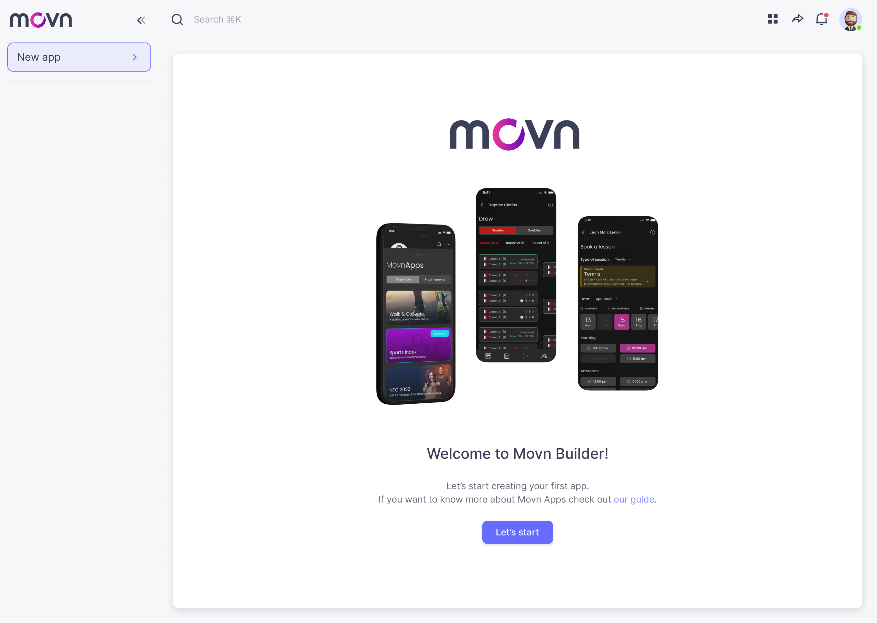 - First time accesing to the Movn Builer. You will see the following screen, you only need to click on the button Lets start! to start the ceation process.