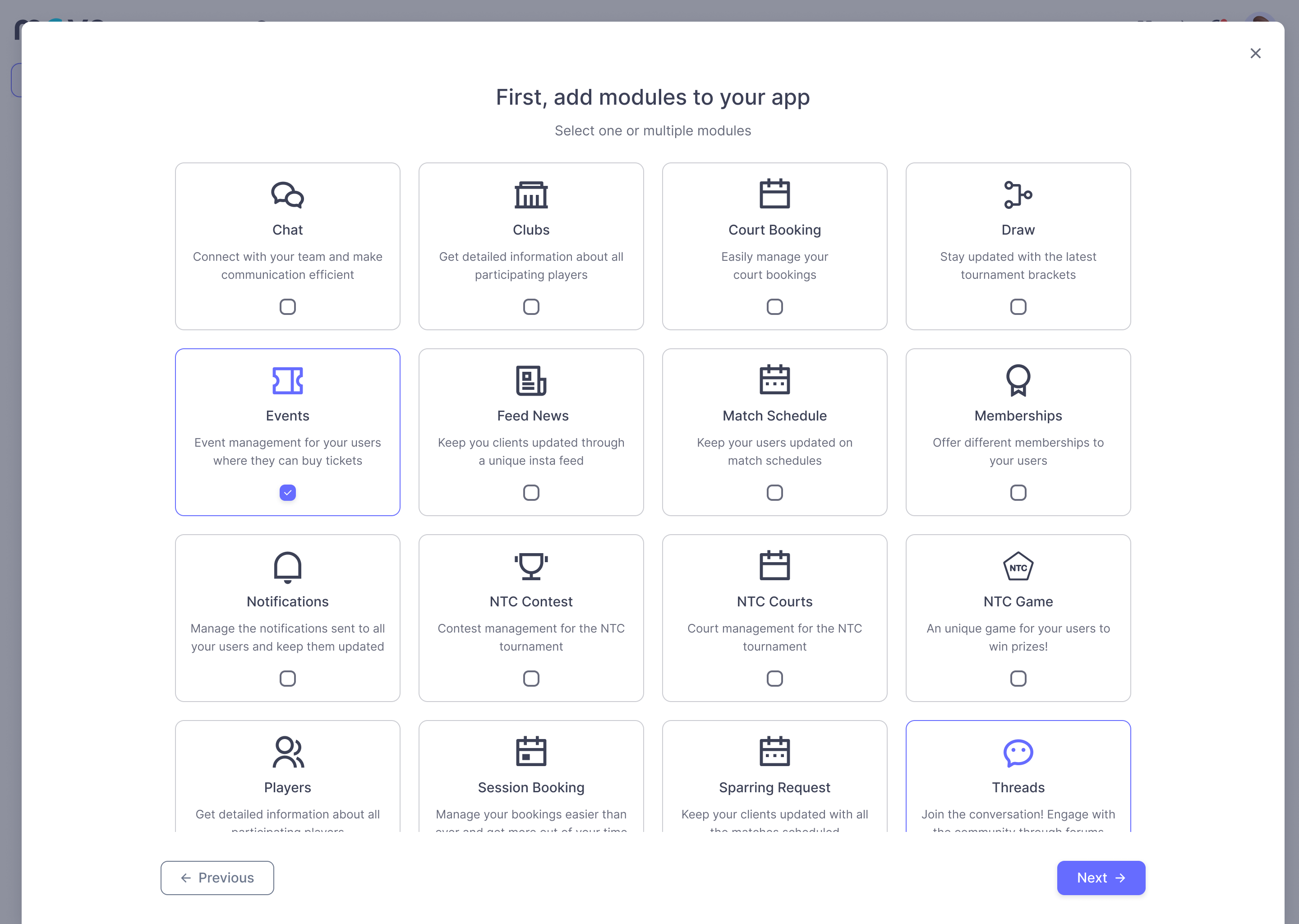 - Select the modules of your app. A list of modules will appear, you only need to select the ones you need.