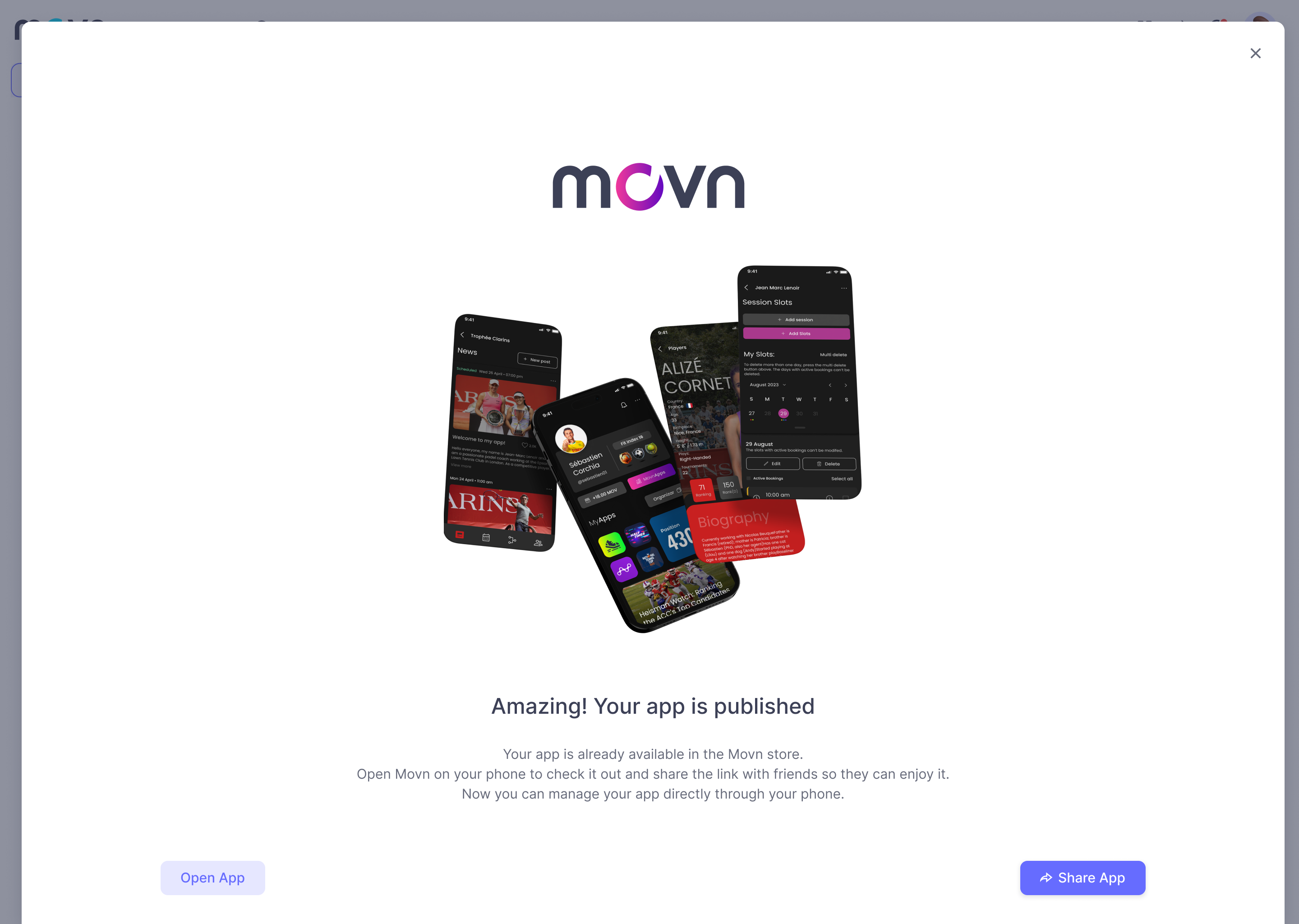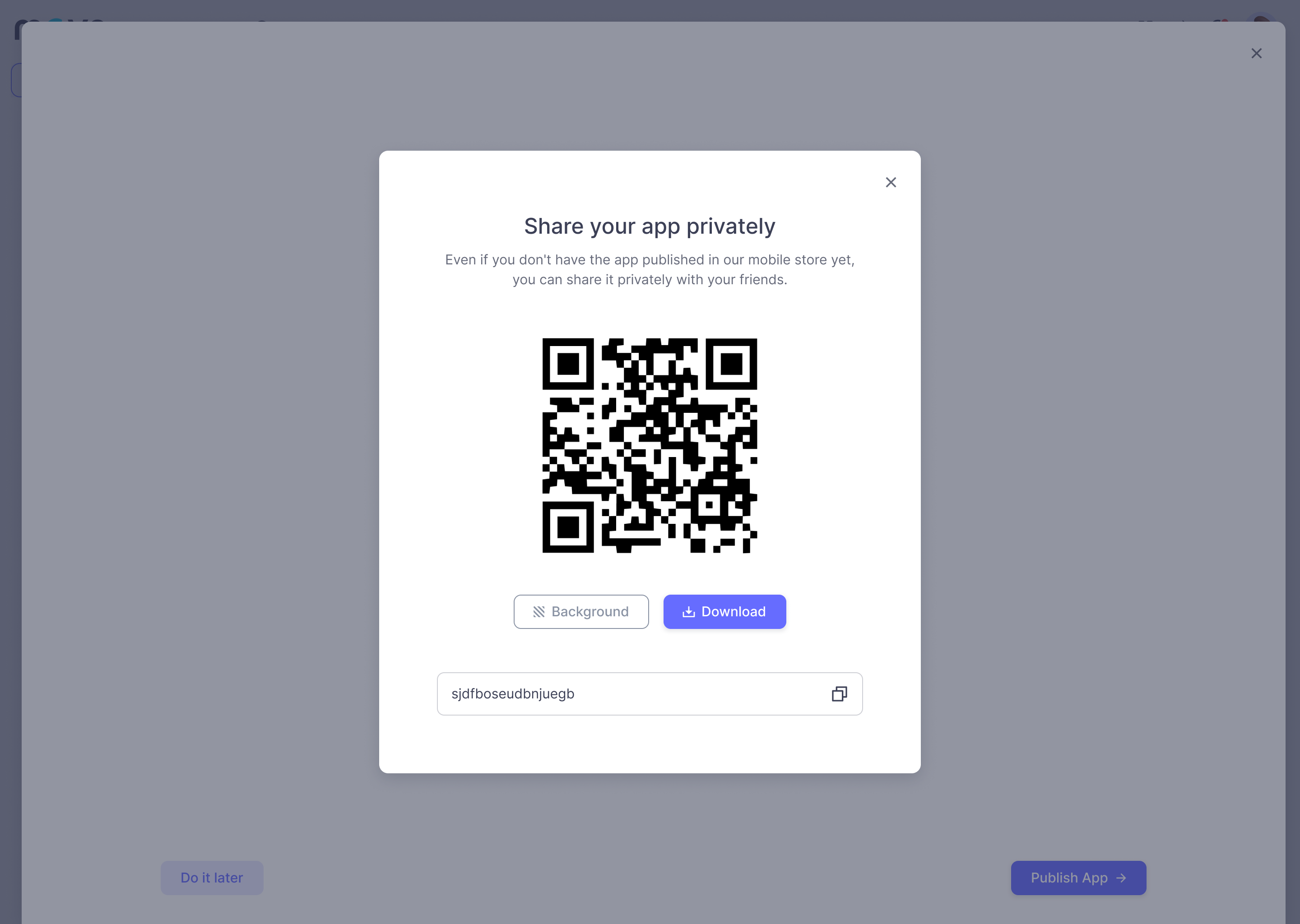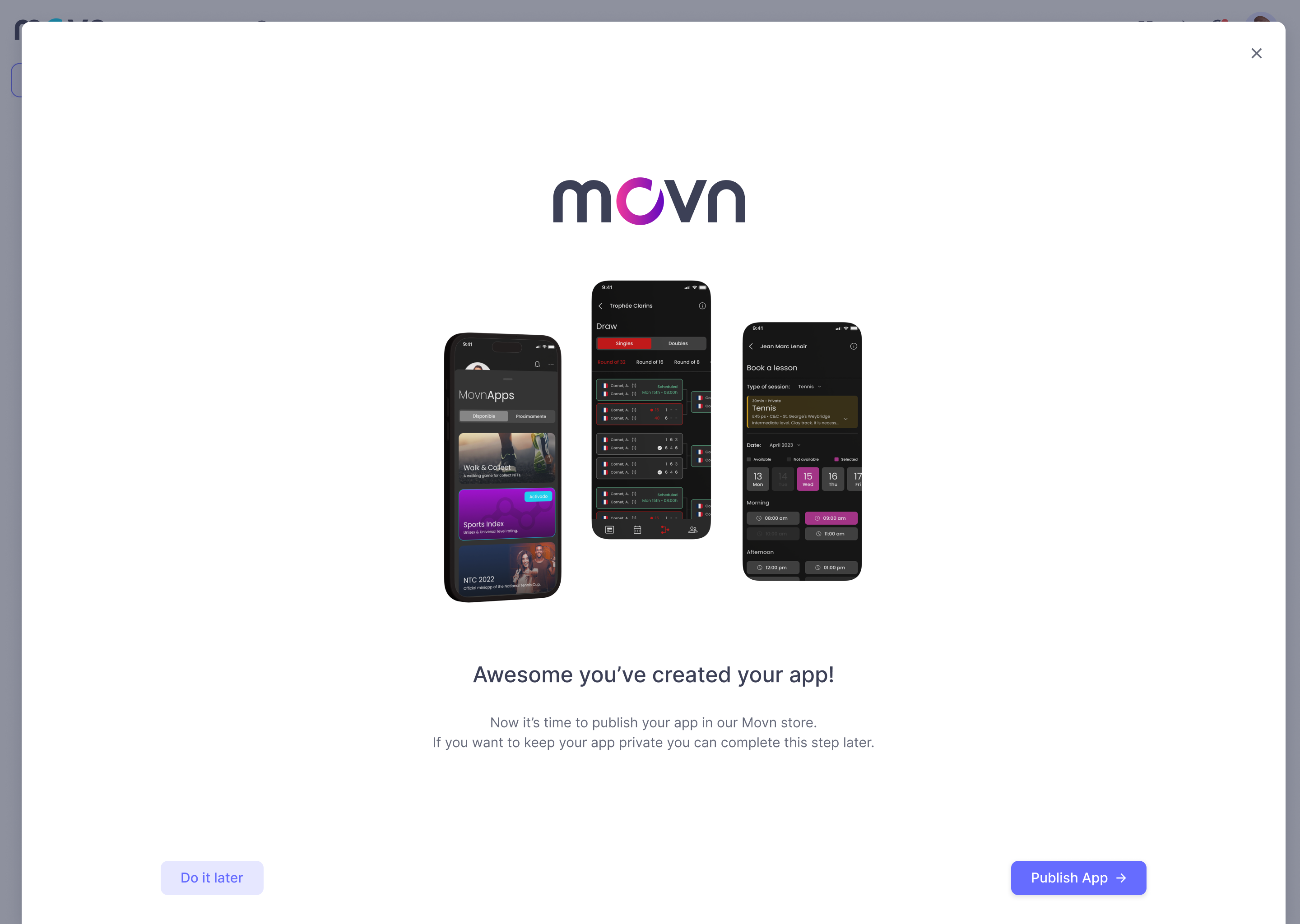 - If you choose Do it later: your app will be in stand by, (it won't be published on the Movn store) but don't worry, if you want you can share with your friends privately with a QR or a Link.