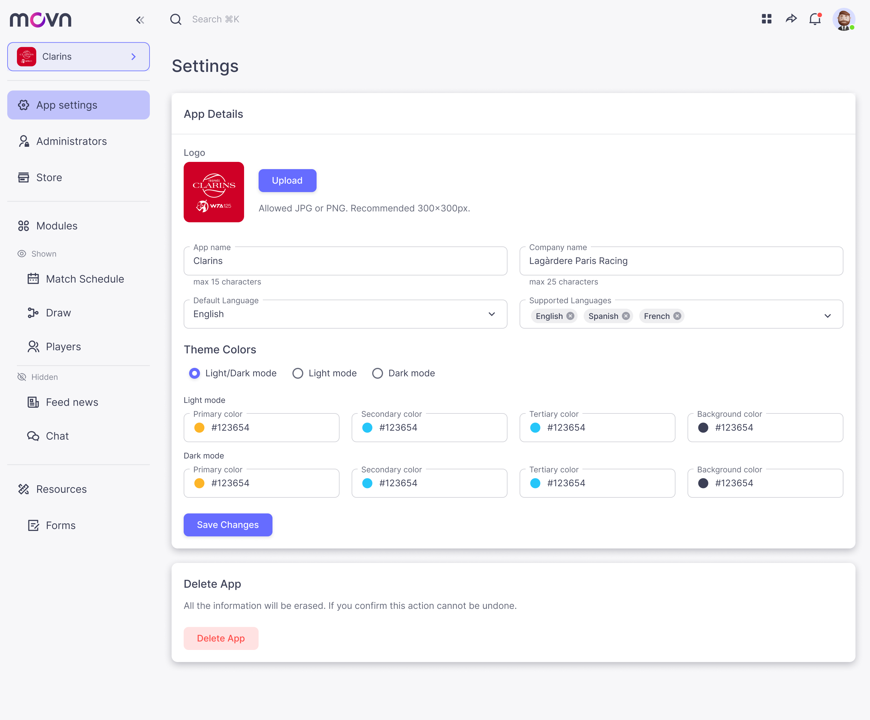 - Theme colors. You can set the colors you want for your app. Set if your app has only light, dark or both themes available.
