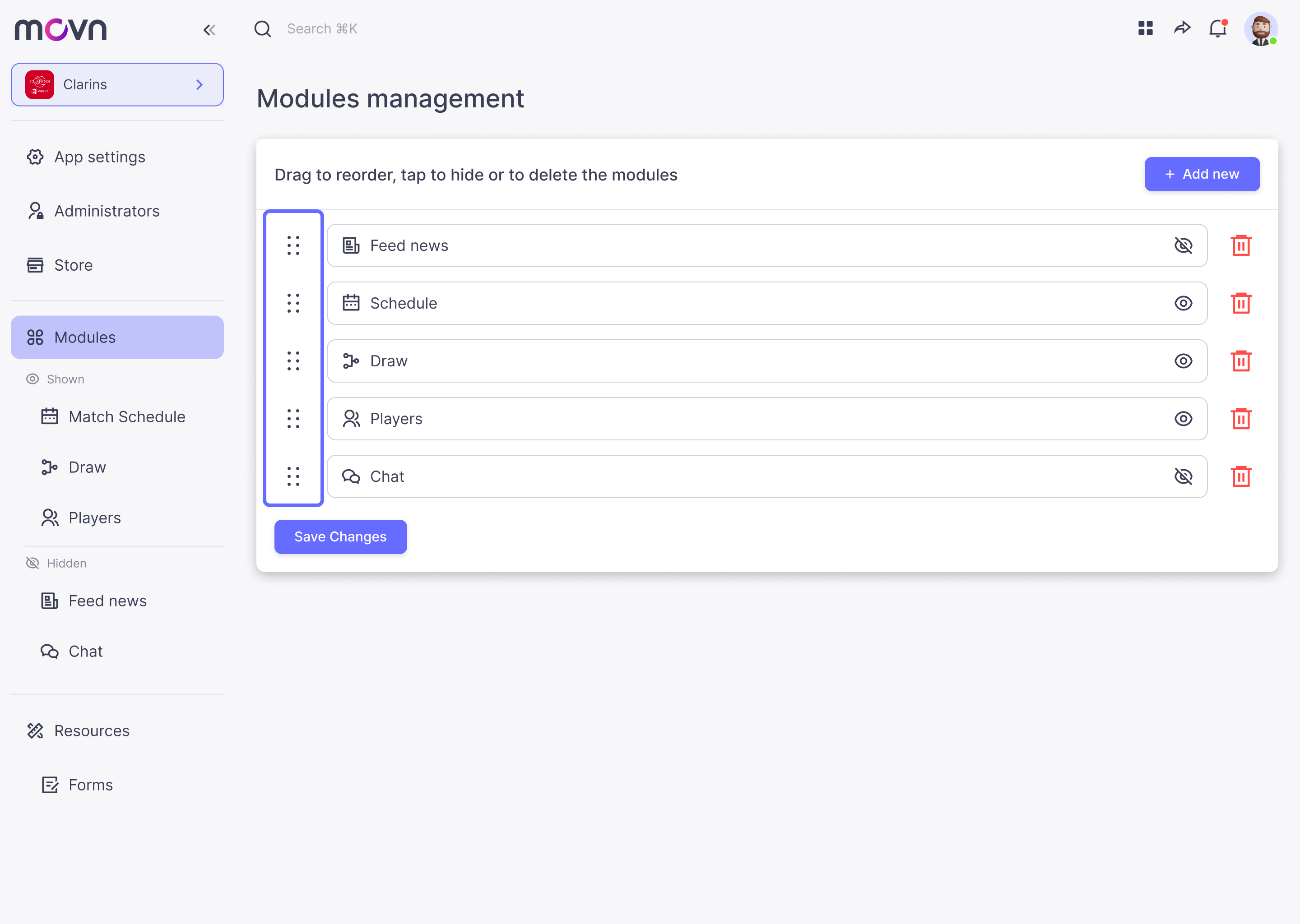 Note: the order of the list indicates the order from left to right of the lower menu of your app.