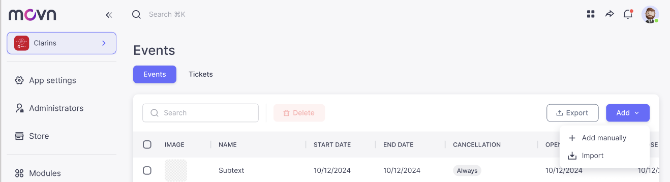 - First you need to add the module Events to your app. If you don't know how, please go to How to add a new module to my app?